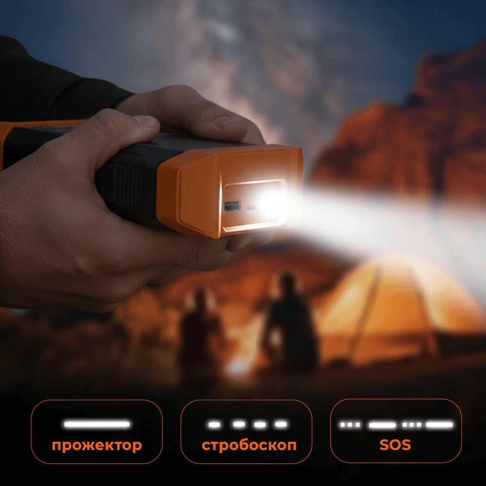 Встроенный фонарь имеет 3 режима работы: прожектор / стробоскоп / SOS. Незаменим в тёмное время суток при остановке на трассе, обслуживании машины и отдыхе на природе.